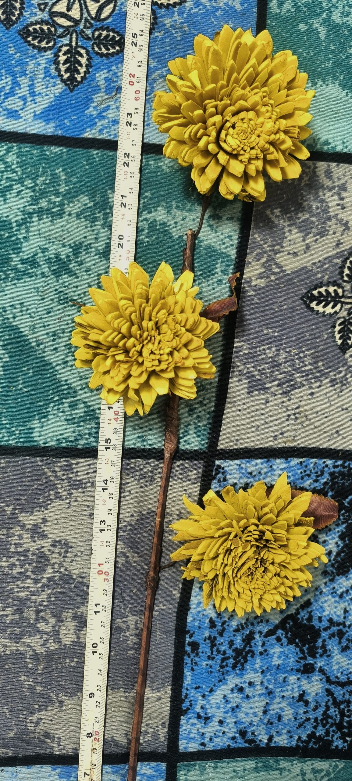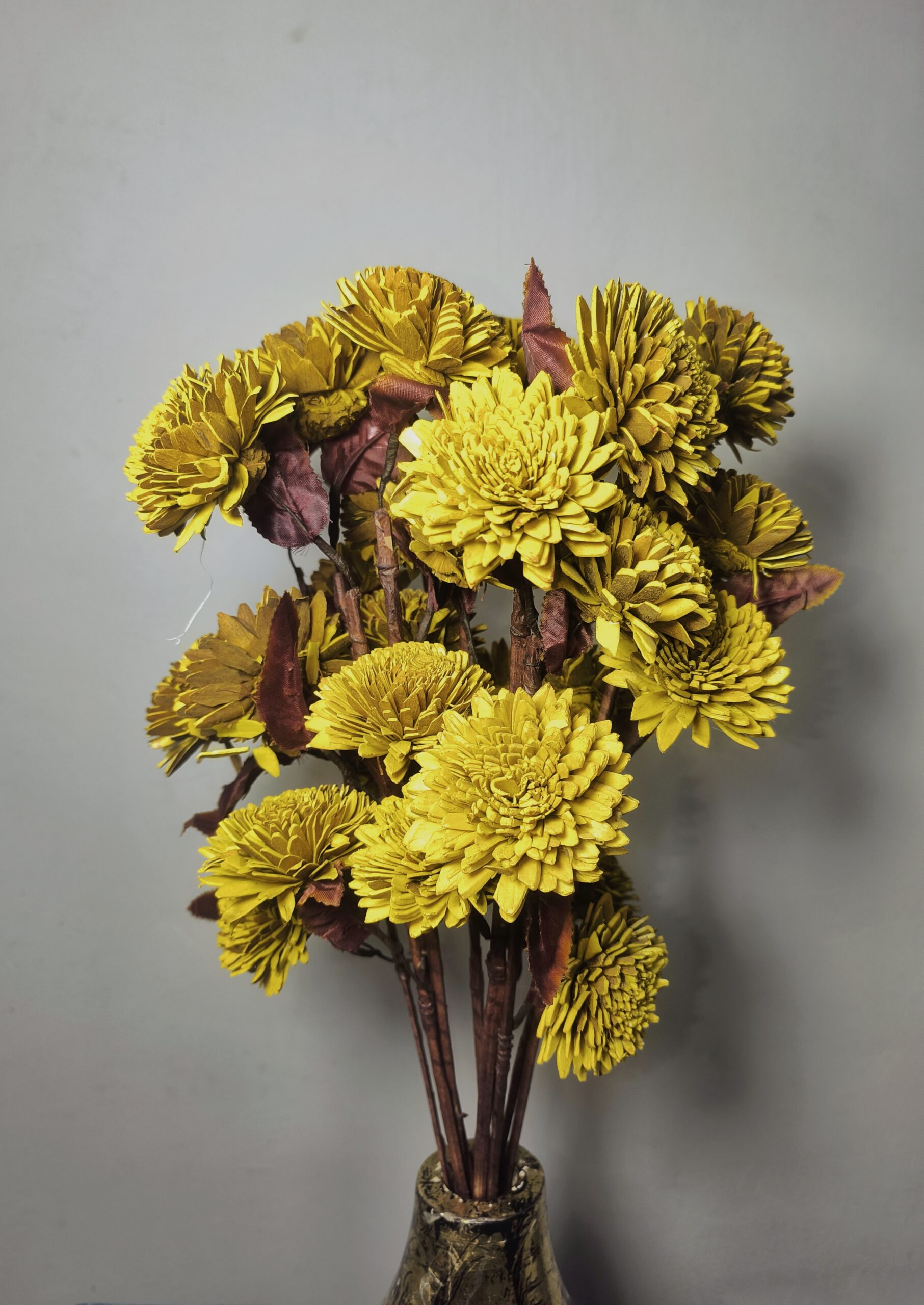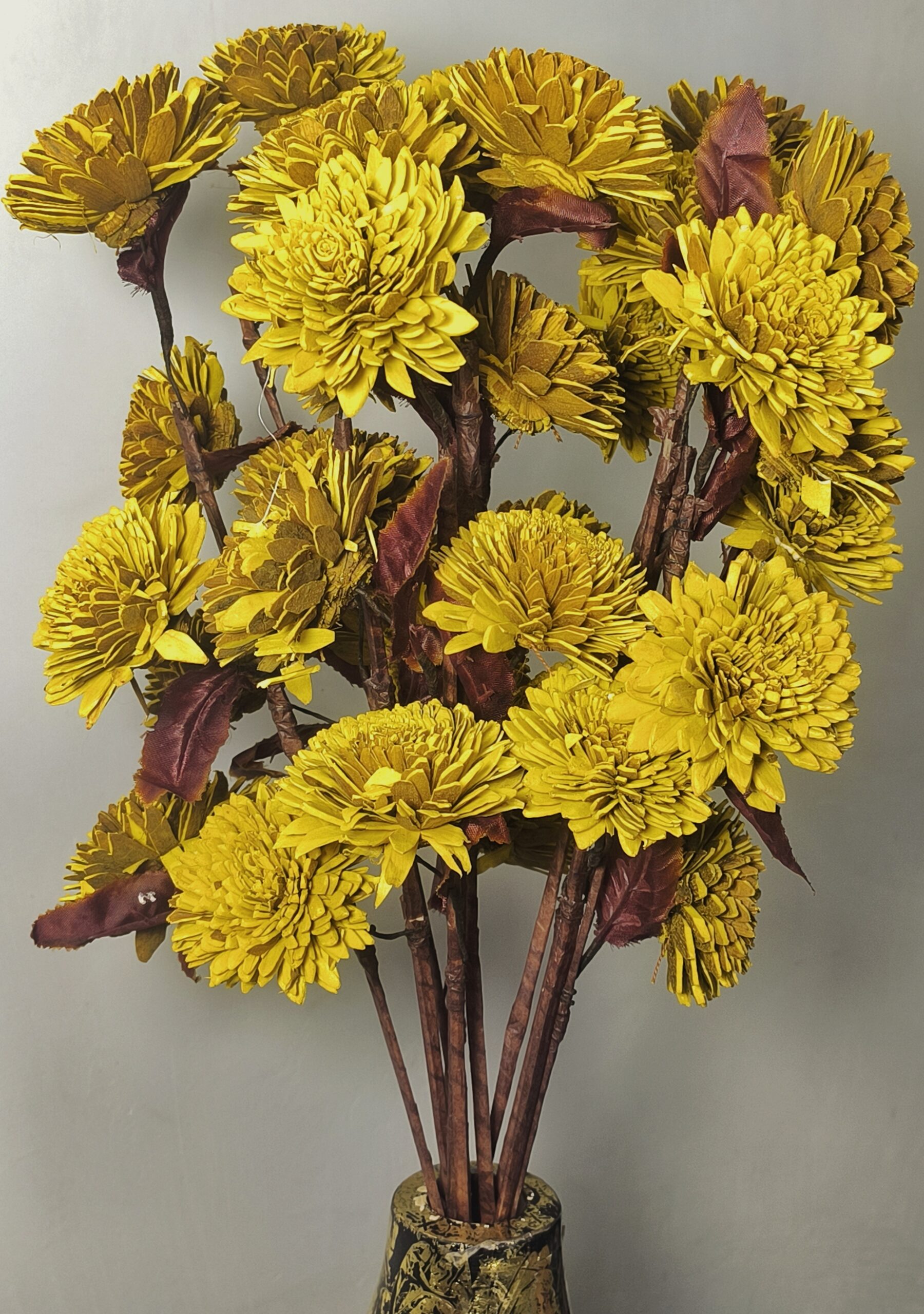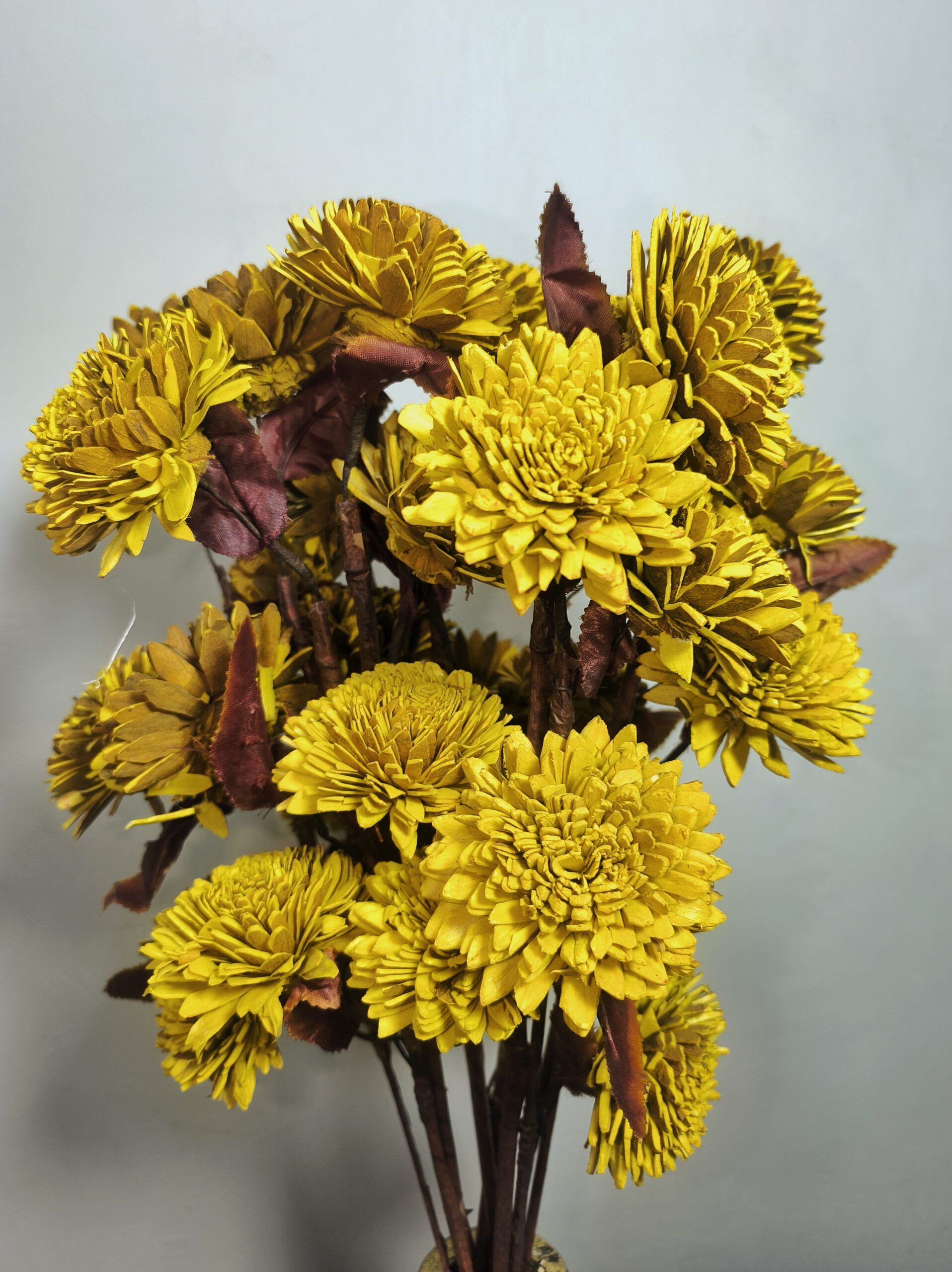 Brighten your décor with these handcrafted yellow Sola Wood Chrysanthemum stems, carefully carved from natural sola wood and hand-dyed in a vibrant golden-yellow shade. Each bloom features multiple layered petals, creating a full, realistic chrysanthemum (mum) appearance that adds warmth and elegance to any space.